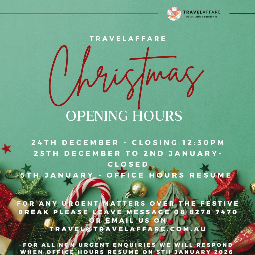 To help you plan your contact with us over the holidays, we have outlined our Christmas and New Year trading hours below. We look forward to assisting you and your travel plans in 2026, and wish you a safe and happy festive season.
